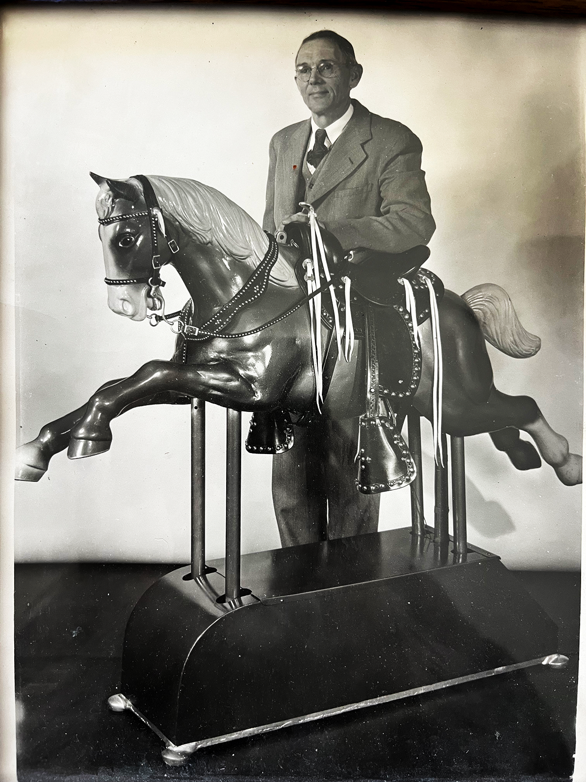 The name Electric Pony carries a family legacy that stretches back four generations. It’s inspired by Jennifer’s great-grandfather, James Otto Hahs, who invented the first coin-operated mechanical horse as a Christmas present for his 6 children to help them learn to ride different gaits.