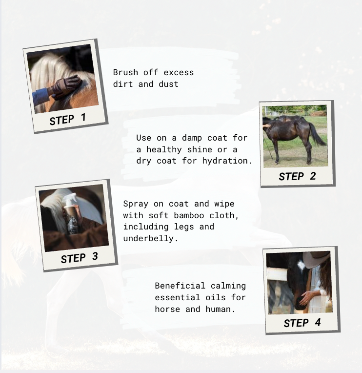- FOR SHINE, COAT: Spray directly on a clean coat (damp or dry) in sections and wipe with our bamboo cloth OR spray directly onto the cloth and wipe.
